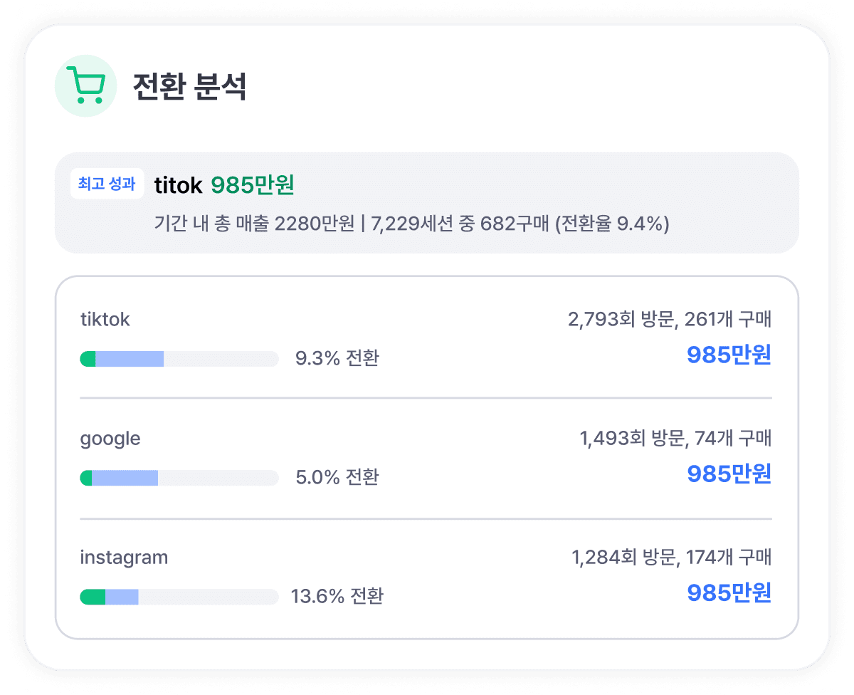 Cafe24 공식 API를 통해 정확한 주문수와 결제금액을 집계하고, 매우 정밀한 추적 로그를 기반으로 시간별&주문정보 별 매칭을 수행해 99% 이상 정확해요.