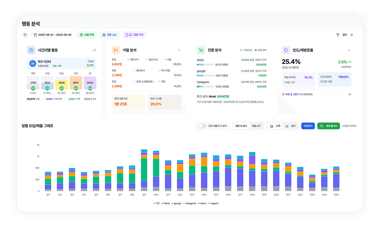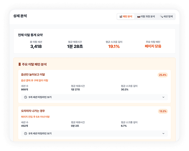 실시간 갱신되는 고객의 타임라인별 이탈•전환 포인트를 즉시 확인하고 상세페이지 개선에 활용할 수 있어요.